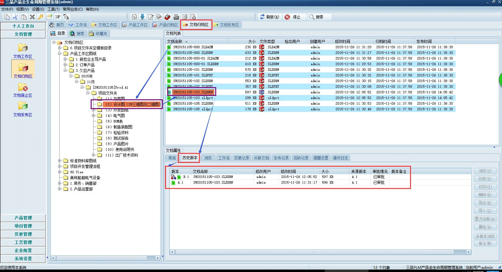 三品PDM系統有效管理所有圖紙及各類文檔資料,圖檔在修改及變更后會在系統中產生新的版本/版次,即升版,歷史版本信息見下圖: