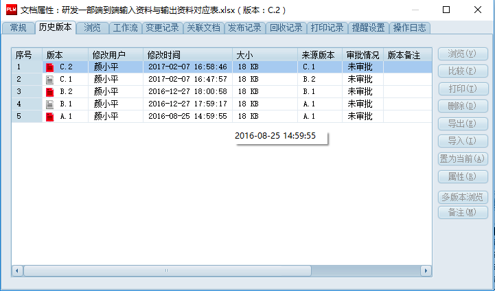 3、各類文檔均可能單獨(dú)查詢歷史版本、變更記錄、打印記錄、回收記錄、執(zhí)行的流程以及詳細(xì)的操作日志,便于追溯文件的各類活動軌跡。