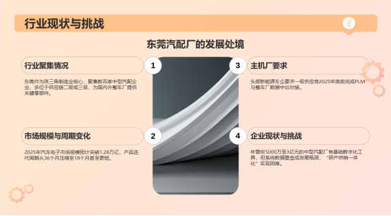 行業數據顯示,汽車電子市場規模預計在2025年突破1.28萬億元,而產品迭代周期已從傳統的36個月壓縮至18個月甚至更短。更嚴峻的是,主機廠對供應鏈協同提出了更高要求,一些頭部新能源車企已明確要求一級供應商在2025年底前完成PLM系統與整車廠數據中臺的對接。