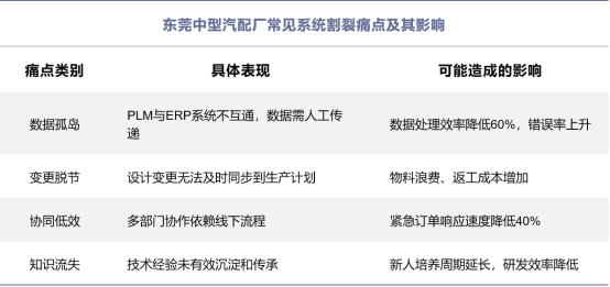 當設計部門與生產部門使用不同系統管理同一產品時,問題自然產生。在東莞中型汽配廠中,四大痛點尤為突出: