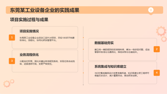 這種效率提升的背后,是業務流程的優化和自動化。以三品軟件服務的東莞某自動化裝備公司的項目為例,通過實施三品PLM系統,企業構建起高效協同的數字化研發管理體系,產品數據管理規范性與跨部門協作效率顯著提升。