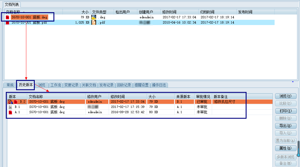 三品EDM系統(tǒng)有效管理所有技術(shù)文件、檔案記錄、管理配套文件等電子檔資料,文件在修改及變更后會在系統(tǒng)中產(chǎn)生新的版本/版次,即升版,歷史版本信息見下圖: