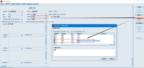 如果請假的窗體表單已經和該流程綁定,在沒有設置流程轉移條件的情況中,用戶填寫好請假表單后,發起該流程時,就需要用戶手動選擇對應的流程節點,如下圖: