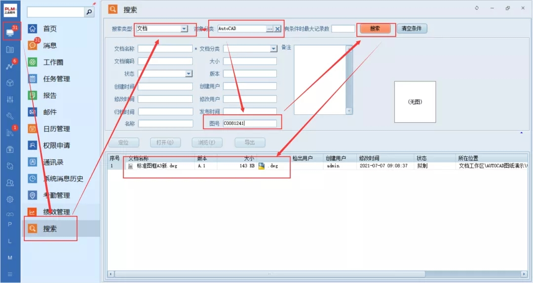 2.快速搜索DWG文檔:通過(guò)文檔屬性映射搜索,快速查找定位文檔,間接實(shí)現(xiàn)DWG文檔全文搜索功能。