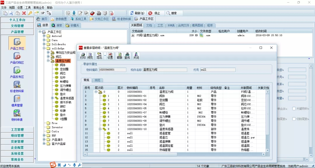 為了更好解決BOM清單的準確性、快速導出等問題,PDM系統支持從Solid Edge圖紙信息中提取屬性信息和裝配信息,自動生成產品結構樹,匯總BOM信息等。