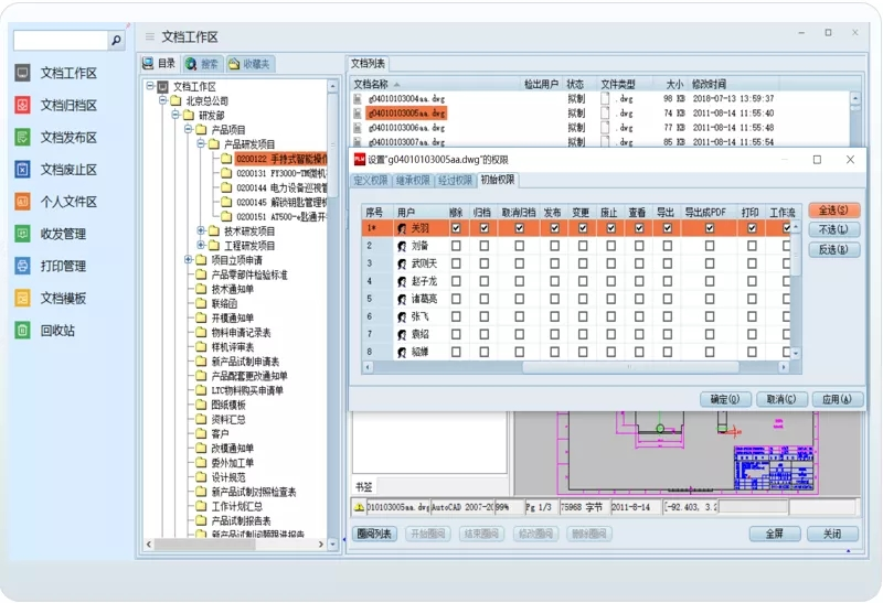 在三品EDM圖文檔管理系統中,由管理員統一分配系統權限,即用戶對某個對象進行某種操作的權限,其中的對象包括零件及其屬性、圖紙、工藝、明細以及其他各種格式文件等可操作的元素;操作包括上傳、瀏覽、檢入、檢出、下載、打印等。