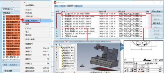 1、設計人員提交圖紙:設計人員完成圖紙設計并自檢后,在三品PLM系統中通過“創建工作流”功能將圖紙提交給相關部門或負責人啟動審核流程。
