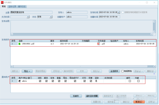 4、發布與外發執行:審批通過后,在系統中對外發圖紙執行【發布】操作。“發布”操作會確定最終外發版本(文檔狀態變為鎖定狀態,圖標呈現綠色,不可再編輯修改),并可填寫發布。系統管理員或授權人員根據審批結果和發布記錄,通過安全可靠的渠道將圖紙外發給指定接收方,并詳細記錄外發時間、接收方確認回執等關鍵信息,確保全過程可追溯。