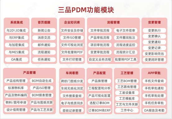 三品PDM系統基礎功能覆蓋產品數據管理及研發協同的各個方面,包括產品結構管理、圖文檔管理、產品配置管理、統一編碼管理、工作流程管理、郵件管理及權限管理等,其他增強功能包括對各種CAD軟件的集成、ERP集成、異地協同、其他應用系統集成及為企業提供個性化的定制開發服務。