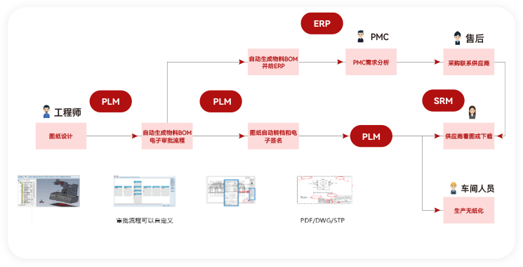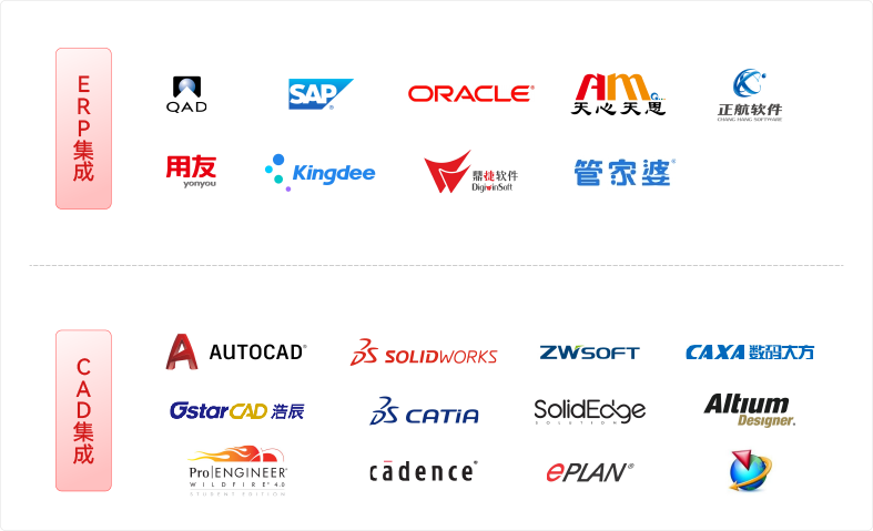 與CAD/CAPP/ERP/MES/CRM/SRM/OA等系統無縫集成,將各系統中的共同信息提取出來,實現各個系統在數據級上的集成,保證數據一次性輸入,多次重用。