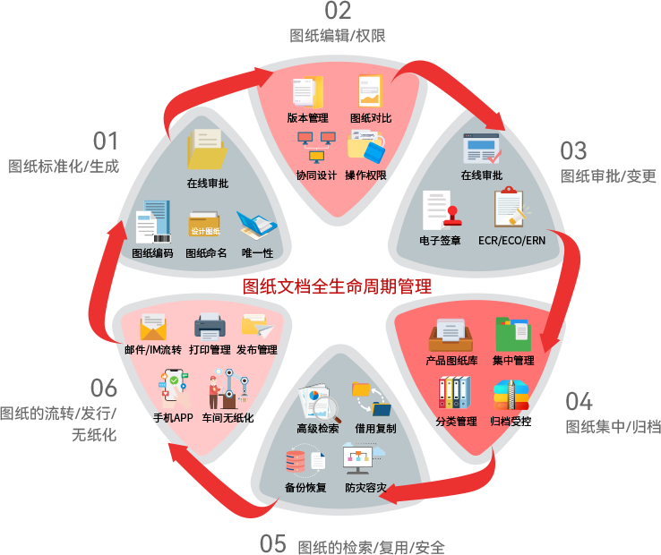 涵蓋圖文檔創建、草擬、審批、發布、歸檔、變更、廢止等生命周期的管理;智能的版本管理,控制文檔的有效性及跟蹤文檔的變化歷史;嚴謹的變更管理,支持CMII管理規范,變更記錄可追溯;強大的編碼管理,編碼系統自動生成,確保編碼唯一性。